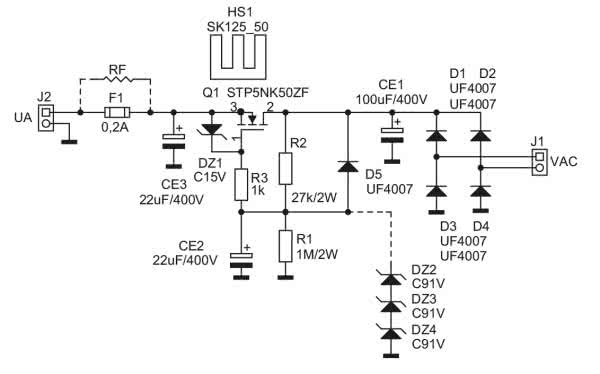 Napięcie przemienne poprzez prostownik mostkowy D1…D4 złożony z szybkich diod UF4007 oraz kondensator filtrujący CE1 doprowadzone jest do układu filtracji aktywnej opartego na tranzystorze Q1. Tranzystor umieszczony jest na radiatorze typu SK125-50. Dzielnik R1, R2 polaryzuje bramkę Q1, kondensator CE2 filtruje i zapewnia łagodne narastanie napięcia anodowego po włączeniu zasilania. R3 zabezpiecza układ przed oscylacjami. Dioda DZ1 chroni bramkę tranzystora przed przebiciem.