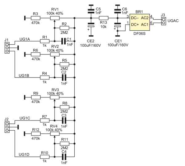 Napięcie z uzwojenia siatkowego doprowadzone jest do złącza J3, gdzie po prostowaniu BR1 i filtracji CE1, R13, CE2, podawane jest na cztery identyczne dzielniki rezystorowe. Zastosowanie czterech układów umożliwia zasilanie siatek np. w stereofonicznym wzmacniaczu PP. Napięcia siatek doprowadzone są do złączy J1, J2.