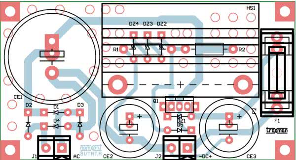 Wszystkie zasilacze umieszczone są na niewielkich jednostronnych płytkach drukowanych. Schematy płytek wraz z rozmieszczeniem elementów pokazano na rysunkach 7, 8, 9.