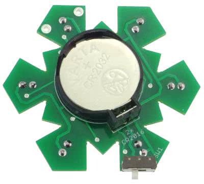 Do zasilania śnieżynki najlepiej skorzystać z baterii CR2032 lub dwóch CR2016, co daje nam poprawny zakres pracy przy napięciu 3…6 V. Przy zastosowaniu dwóch baterii CR2016 należy odizolować elektrycznie „łapkę” utrzymującą je w koszyku za pomocą np. taśmy izolacyjnej naklejonej w miejscu jego styku z dolną baterią. Można też wygiąć „łapkę” w łuk, co wyeliminuje problem niepotrzebnego zwarcia przy wymianie baterii – rysunek 4. Zmontowany układ jest pokazany na fotografii tytułowej a widok od strony baterii pokazuje fotografia 5.