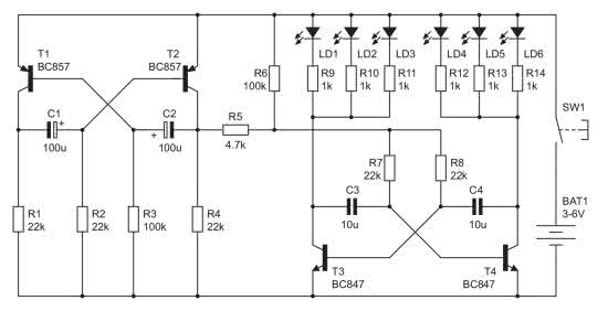 Częstotliwość migania diod LED zależy także od napięcia w punkcie połączenia R5, R6, a napięcie to zmienia się w rytm pracy drugiego multiwibratora zbudowanego z tranzystorów T1, T2.