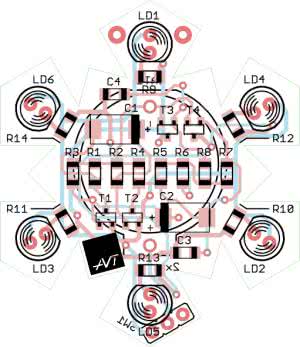 Układ należy zmontować na płytce drukowanej, której obrys zmieści się w okręgu o średnicy 50 mm. Większość elementów przewidziana jest do montażu powierzchniowego (SMD), dlatego do tej czynności niezbędna będzie lutownica z ostrym grotem i trochę wprawy. Montaż rozpoczynamy od wlutowania rezystorów R1…R14 oraz kondensatorów C3 i C4. W kolejnym etapie montujemy tranzystory T1…T4 oraz kondensatory C1 i C2 zgodnie z polaryzacją. Koszyk baterii BAT1 wraz z przełącznikiem SW1 wlutować należy po przeciwnej stronie płytki. Na koniec należy wlutować diody LED niebieskie LD1…LD3 oraz białe LD4…LD6.