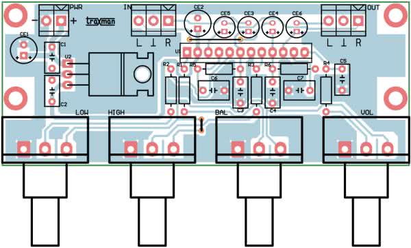 Sygnał wejściowy z gniazda IN doprowadzony jest bloku regulacji barwy dźwięku. Elementy R5, C6 i R6, C7 kształtują charakterystykę regulacji. Poziom częstotliwości niskich i wysokich określa napięcie na wyprowadzeniach LOW, HIGH układu.