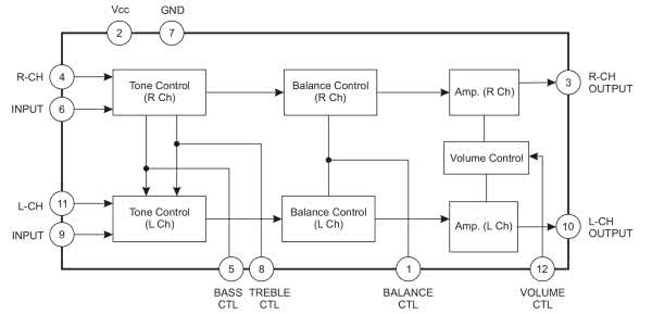 W przedwzmacniaczu zastosowano specjalizowany układ KA2107, będący aktywnym układem regulacji barwy dźwięku, balansu i poziomu. Strukturę wewnętrzną układu pokazuje rysunek 1.