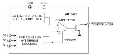 Układ zawiera w swojej strukturze przetwornik temperatury, konwerter analogowo cyfrowy, komparator o konfigurowanym progu zadziałania i histerezie oraz klucz wyjściowy MOSFET w konfiguracji OD. Wybór progu i histerezy ADT6401 odbywa się przy pomocy wyprowadzeń S0, S1, S2, konfigurację pokazuje tabela 1. W modelu ustalono próg przełączania termostatów na 45°C z histerezą 2°C (wyprowadzenia S0, S1, S2 połączone z masą).