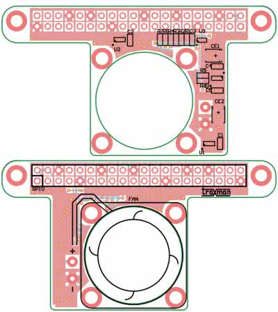 Zapewnia on wystarczającą wydajność dla schłodzenia SoC nie zajmując zbyt wiele miejsca w obudowie. W module przewidziano dwa sposoby sterowania temperaturą, pierwszy programowy z Raspberry Pi przy pomocy sygnału FAN generowanego np. na podstawie temperatury SoC, drugi sprzętowy z termostatów U1, U2 typu ADT6401 umieszczonych w dwóch różnych miejscach płytki.