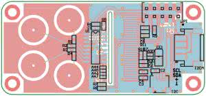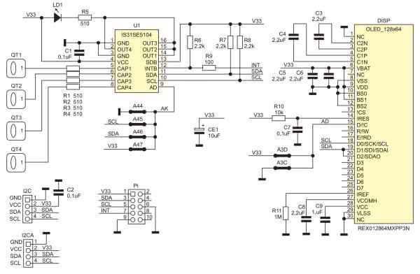 Uzupełnieniem wyświetlacza jest czteropolowa klawiatura dotykowa. Jako jej kontroler został wybrany układ IS31SE5104 ISSI. Jest to jeden z najprostszych w aplikacji, przystępnych cenowo i pewnie działających ze znanych mi układów obsługujących klawiatury dotykowe. Komunikacja U1 z systemem nadrzędnym odbywa się podobnie jak w przypadku wyświetlacza przez magistralę I2C. Zworami A44...A47 można wybrać adres bazowy kontrolera 0x44...0x47. U1 może generować sprzętowe przerwanie po wykryciu dotknięcia pola, jeżeli chcemy wykorzystać sygnał INT, na płytce lutujemy rezystory R6, R9, polaryzujące wyjście INTB U1. Sygnał przerwania dostępny jest na GPIO4. Wyjścia OUT, typu OD, sygnalizujące sprzętowo aktywny dotyk, połączone są równolegle i sterują diodą LD1, gdy którekolwiek z pól jest dotknięte.