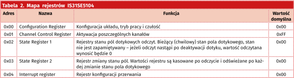 Dla sprawdzenia działania kontrolera klawiatury dotykowej użyjemy narzędzia z pakietu i2c-tools. W większości przypadków układ zadziała już po włączeniu zasilania na domyślnej konfiguracji; każde dotkniecie pola zasygnalizowane jest zaświeceniem LD. Mapę rejestrów IS31SE5104 pokazano w tabeli 2, natomiast dokładne znaczenie poszczególnych bitów znajdziemy w dokumentacji układu.