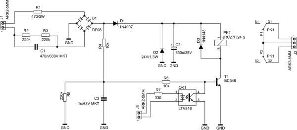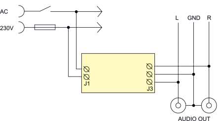 Schemat ideowy został pokazany na rysunku 1. Zasilanie napięciem przemiennym o wartości skutecznej 230 V podaje się na zaciski złącza J1.