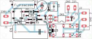 Układ został zmontowany na jednostronnej płytce drukowanej o wymiarach 70×30 mm, której schemat jest pokazany na rysunku 2. Otwory montażowe o średnicy 3,2 mm znajdują się w odległości 3 mm od krawędzi płytki.