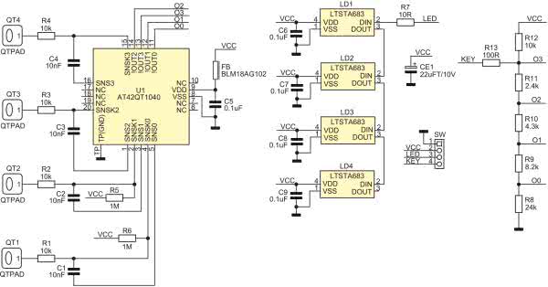 Schemat układu został pokazany na rysunku 1. Bazuje na specjalizowanym kontrolerze AT42QT1040, który obsługuje cztery pola dotykowe z funkcją przycisku chwilowego. Jako sensory dla służą pola QT1...QT4 o średnicy 10 mm, wykonane bezpośrednio na płytce drukowanej. Kondensatory C1...C4 odpowiadają za czułość przycisków – dla mniejszych wartości (np. 2,2 nF) czułość jest niższa, ale rośnie odporność na zakłócenia i szybkość detekcji. Użyteczny zakres pojemności wynosi 2,2...22 nF i należy je dobrać doświadczalnie, po zamontowaniu klawiatury w obudowie.
