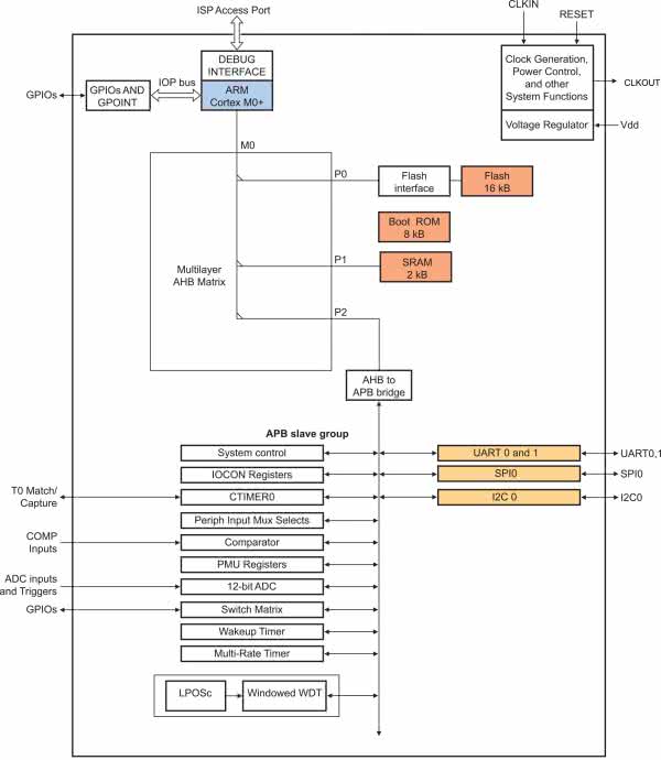 Struktura wewnętrzna mikrokontrolera LPC802 została pokazana na rysunku 1. Jest to najmniejszy przedstawiciel rodziny LPC80x z rdzeniem Cortex-M0+, i został wyposażony w 16 kB pamięci Flash, 2 kB pamięci RAM i elastycznie konfigurowanych 13 wyprowadzeń GPIO, obsługujących m.in.: USART, I2C, SPI, ADC. Bootloader korzystający z portu szeregowego UART pozwala programować procesor w systemie. Program bootloadera jest umieszczony w wydzielonej części pamięci, nie ma więc też ryzyka jego omyłkowego skasowania.
