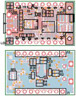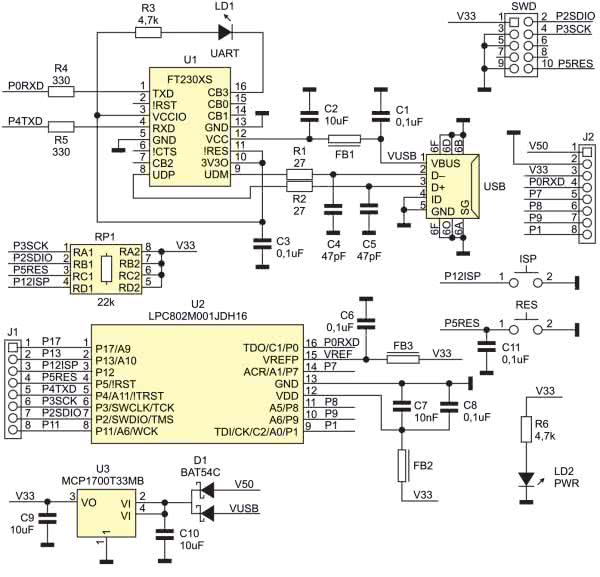 Schemat minimodułu został pokazany na rysunku 2. Na niewielkiej płytce drukowanej o wymiarach 30×18 mm umieszczono wszystkie elementy niezbędne do rozpoczęcia pracy z LPC802. Oprócz procesora U2 istotnym elementem jest konwerter USB/USART typu FTDI230XS. Pełni on funkcję programatora współpracującego z wbudowanym bootloaderem i aplikacją FlashMagic lub konwertera USB/UART łączącego LPC802 z komputerem nadrzędnym. Aplikacja FT230XS jest typowa, dioda LD1 sygnalizuje transmisje poprzez UART, ze względu na ograniczone miejsce zrezygnowałem z osobnych LED sygnalizujących sygnały RXD/TXD.