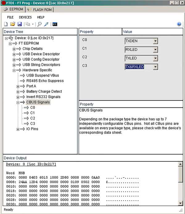 Moduł zmontowany ze sprawnych elementów nie wymaga uruchamiania. Przy pomocy oprogramowania FT_Prog należy skonfigurować GPIO FT230XS zgodnie z rysunkiem 4, ustawiając pin C3 na sygnalizację sumy sygnałów RXLED+TXLED. Przykładowa konfiguracja dołączona jest do materiałów dodatkowych. Po restarcie układu FT230XS, można używać modułu we własnej aplikacji.