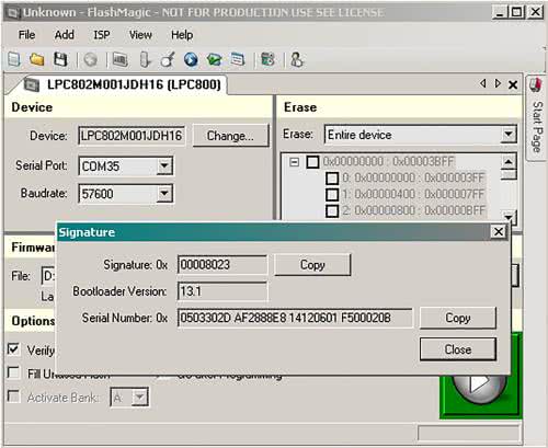 Po uruchomieniu programu FlashMagic i wyborze typu procesora oraz portu szeregowego, sprawdzamy odczyt sygnatury układu (ISP\Read Signature). Jeżeli odczyt działa to można przejść do programowania układu. W przypadku problemów należy ponowić wprowadzenie układu w tryb ISP.