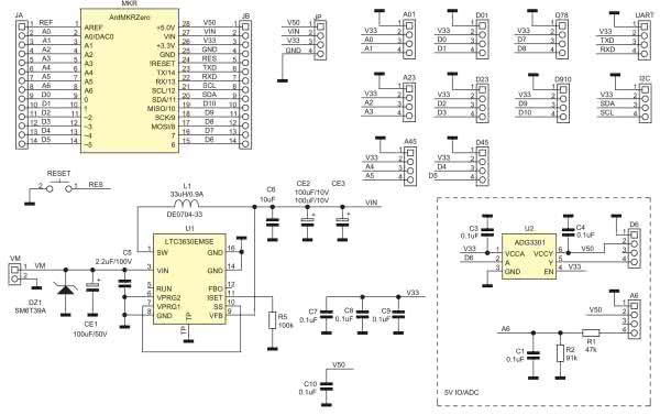 Należy pamiętać, że płytki MKR mają wyprowadzenia IO zgodne ze standardem 3,3 V, podłączenie do nich czujników z wyjściem 5 V uszkodzi procesor. W związku z tym na płytce przewidziano opcjonalny obwód umożliwiający współpracę MKR z systemami 5 V wyróżniony na schemacie ramką. Układ U2 typu ADG3301 jest dwukierunkowym konwerterem poziomów napięć dla wyprowadzenia 6. Elementy R1, R2 i C1 to dzielnik napięcia z 5 V na 3,3 V połączony z wyprowadzeniem A6. Sygnały 6 i A6 doprowadzone są na płytce do wyróżnionych złączy D6, A6. Do złączy tych doprowadzone jest także napięcie V50 z płytki MKR. Gdy układ zasilany będzie tylko z akumulatora podłączonego do MKR Zero, napięcie V50 nie jest dostarczane i złącza A6, D6 nie powinny być wykorzystywane.