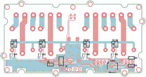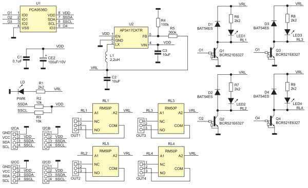 Oprócz układu U1 typu PCA9536D zawiera przetwornicę obniżającą U2 typu AP3417, odpowiedzialną za dostarczanie napięcia ok. 2,8 V do zasilania cewek przekaźników RL1...4. Zastosowano przekaźniki miniaturowe typu RM50 z cewką 3,3 V, która posiada roboczy zakres napięć zasilania 2,25...3,9 V, dzięki czemu moduł pracuje stabilnie w zakresie zasilania 3,3...5 V, bez przeciążania cewek przekaźników.