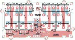Jako drivery sterujące zastosowano tranzystory Q1...4 typu BCR521, które posiadają wbudowany dzielnik w obwodzie bazy, zmniejszający liczbę niezbędnych elementów. Wysterowanie przekaźnika sygnalizowane jest świeceniem odpowiedniej LED1...4.