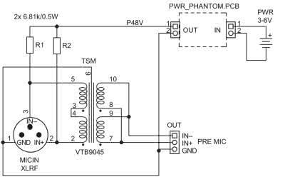Przykładowy sposób włączenia zasilacza w tor mikrofonowy z transformatorem pokazano na rysunku 4.