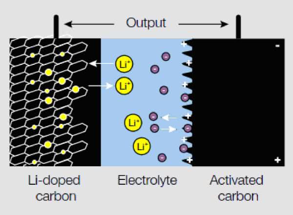 Superkondensator litowy LiCAP (LiC) jest kondensatorem hybrydowym, który gromadzi ładunek nie tylko dzięki właściwościom dielektryka i elektrod, ale także dzięki reakcjom chemicznym zachodzącym podczas jego ładowania i rozładowania. Kondensator LiC zbudowany jest asymetrycznie, jedna z elektrod domieszkowana jest litem, druga tak jak w klasycznym superkondensatorze wykonana jest z węgla aktywowanego. Schematyczną budowę kondensatora hybrydowego w technologii LiCAP pokazano na rysunku 1. Jego budowa i właściwości sprawiają, że jest bardziej podobny do ogniwa litowego LIB (baterii) niż do klasycznego kondensatora. Hybrydowe kondensatory litowe mają wyższe dopuszczalne napięcie pracy, wynoszące 3,8 V (max. 4,2 V) i niższe samorozładowanie.