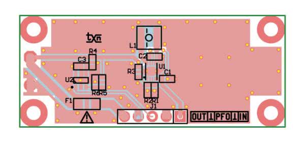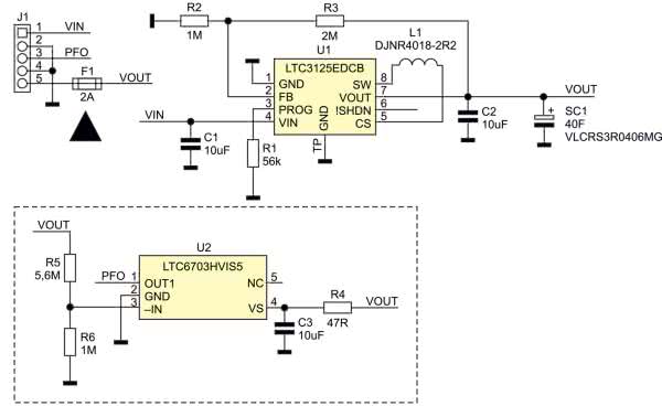 Bezpiecznik F1 zabezpiecza kondensator przed skutkami zwarcia wyjścia. Układ ładowarki uzupełniony jest opcjonalnym niskomocowym komparatorem U2 typu LTC6703 sygnalizującym niski poziom napięcia superkondensatora SC1. Wewnętrzne napięcie odniesienia komparatora ustalone jest na 400 mV, dzielnik R5, R6 ustala próg zadziałania na ok. 2,6 V, co sygnalizowane jest zmianą stanu sygnału PFO na złączu J1 i może zostać użyte do wprowadzenia współpracującego procesora w stan obniżonego poboru mocy. Podczas przełączania komparatora, pomimo wbudowanej niewielkiej histerezy, na wyjściu mogą pojawić się oscylacje, szczególnie gdy napięcie wejściowe VOUT zmienia się bardzo powoli. Dlatego wyjście PFO warto podłączyć do przerwania i eliminować oscylacje na drodze programowej podobnie jak drgania styków. Wyjście PFO jest zrealizowane jako otwarty dren, jego maksymalne napięcie pracy to 40 V. W modelu zastosowany jest komparator LTC6703HVIS5-2 z wejściem odwracającym, można też zastosować układ LTC6703HVIS5-3 z wejściem prostym lub ich niskonapięciowe odpowiedniki LTC6703IS5-x z ograniczonym do 18 V dopuszczalnym napięciem wyjścia OUT.