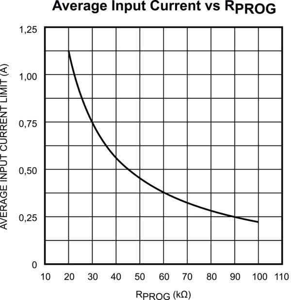Za ograniczenie prądu wejściowego przetwornicy, a tym samym pośrednio prądu ładowania CS1 odpowiada rezystor R1 podłączony do wyprowadzenia PROG. Wartość rezystora odpowiadająca średniemu prądowi wejściowemu dobiera się zgodnie z wykresem z rysunku 4. W modelu ustawiono prąd na ok. 400 mA, co odpowiada R1=56 kV.