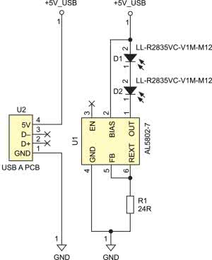 Na rysunku 1 został pokazany schemat elektryczny latarki. Złącze USB jest oznaczone jako element U2. Nie jest to fizyczna złączka, a jedynie pady umieszczone na PCB. Płytka została zamówiona na laminacie o grubości 2 mm. Jest to grubość wystarczająca do tego, aby płytka nie wypadała z gniazda USB oraz by umożliwić pewny styk. Z portu USB pochodzi zasilanie całego urządzenia.