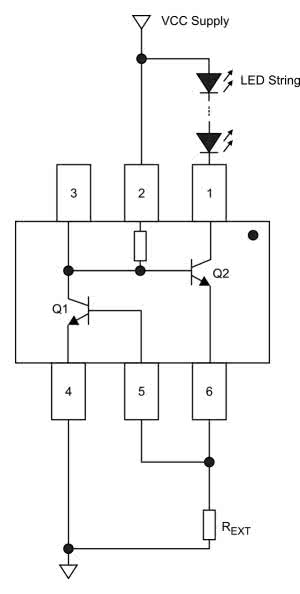 Układ oznaczony U1 to AL5802-7. Jest to sterownik diod LED, działający jak źródło prądowe zbudowane z 2 tranzystorów NPN. Typowy układ aplikacyjny został pokazany na rysunku 2.