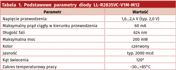 Zastosowane diody LED (D1 i D2) to LL-R2835VC-V1M-M12 w obudowie SMD2835. Podstawowe parametry diody zawarte są w tabeli 1. Ogranicznik prądowy ustawiony jest na 30 mA, a więc na połowę maksymalnego dopuszczalnego prądu diody.