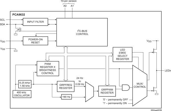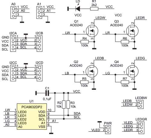 Układ PCA9632DP2 wchodzi w skład rodziny kontrolerów LED firmy NXP. Jest to konfigurowany przez I2C czterokanałowy generator PWM z możliwością indywidualnej i grupowej regulacji PWM z rozdzielczością 8 bitów. Moduł został opracowany w 2 dwóch wariantach: podstawowym – o większym prądzie obciążenia, ale też większej płytce; mini – na niewielkiej płytce i z mniejszym dopuszczalnym obciążeniem.