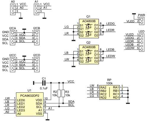Moduł bazuje na podstawowej aplikacji układu PCA9632DP2 (U1), którego strukturę wewnętrzną pokazuje rysunek 1.