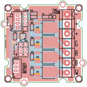 Każdy z modułów wyposażony jest w komplet gniazd dla interfejsu I2C zgodnych z różnymi systemami uruchomieniowymi. Układ U1 w wersji DP2 pozwala na wybór jednego z czterech adresów bazowych (0x60…0x63) przy pomocy zwór A0, A1. Dzięki temu, poprzez jedną magistralę I2C możemy sterować niezależne czterema modułami/taśmami LED RGBW. Jeżeli musimy sterować większą ilością niezależnych taśm, dla zwiększenia puli dostępnych adresów mozna użyć translatora adresów I2C typu LTC4316.
