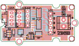 Dioda VCC sygnalizuje obecność zasilania, rezystory R2, R3 polaryzują magistralę I2C. Taśmę LED łączymy poprzez złącze kielichowe LED dla modułu mini lub przez złącza śrubowe LEDGR, LEDBW dla modułu podstawowego. Zasilanie taśm 12 V doprowadzone jest do złącz PWR, należy pamiętać o odpowiedniej wydajności zasilacza dobranej do długości taśmy.
