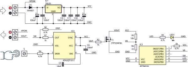 Pracą układu steruje mikrokontroler IC2 typu ATTINY25. Elementem wykonawczym jest tranzystor T1 typu STP55NF06. W roli detektora zbliżeniowego zastosowany został specjalizowany układ AT42QT1011 firmy Atmel oznaczony jako IC3. Wyposażony jest w jedno pole zbliżeniowe oraz wyjście cyfrowe, na którym pojawia się poziom wysoki w momencie zbliżenia ręki do czujnika. Odległość detekcji jest regulowana za pomocą pojemności kondensatora C5 – powinna ona mieścić się w przedziale 2…50 nF. W układzie modelowym pojemność została tak dobrana, aby moduł reagował na zbliżenie z odległości 1,5…2 cm.