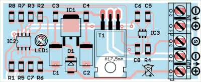 Moduł należy zmontować na płytce drukowanej, której schemat montażowy pokazano na rysunku 2. Montaż układu jest typowy i nie powinien przysporzyć problemów, a moduł po zmontowaniu od razu gotowy jest do pracy. Na rysunku 3 pokazano sposób podłączenia.