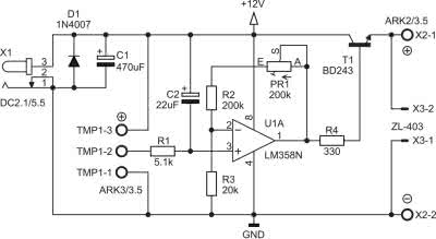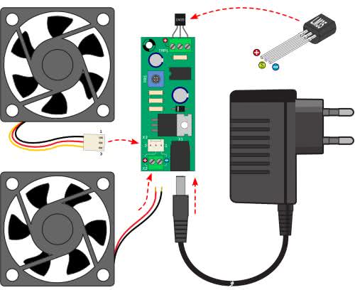 Sercem układu jest wzmacniacz operacyjny U1A typu LM358, który pracuje w całkowicie typowej dla siebie konfiguracji, wzmacniając napięcie pobierane z wyjścia czujnika temperatury do poziomu ustalanego za pomocą szeregowo połączonych rezystancji i potencjometru. Jako czujnik temperatury zastosowano przetwornik temperatura–napięcie, typu LM35. Do wyjścia wzmacniacza operacyjnego jest dołączony tranzystor wykonawczy T1 w konfiguracji wspólnego kolektora (wtórnik). Na jego emiterze występuje napięcie równe napięciu na wyjściu wzmacniacza operacyjnego, pomniejszonemu o napięcie odkładające się na złączu emiter–baza. Wynika z tego, że wentylator zasilany poprzez T1 nigdy nie otrzyma pełnego napięcia 12 V, a jedynie ok. 11,3 V.