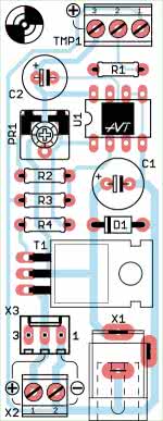Układ należy zmontować na płytce, której projekt pokazano na rysunku 2. Ułatwieniem podczas montażu będzie fotografia tytułowa. Całość została zmontowana na jednostronnej płytce drukowanej o wymiarach 25×65 mm. Wszystkie komponenty zastosowane w projekcie są popularne i łatwo dostępne. Montaż układu należy rozpocząć od wlutowania rezystorów i innych elementów o niewielkich rozmiarach, a zakończyć na złączu zasilania i włożeniu układu scalonego w podstawkę.