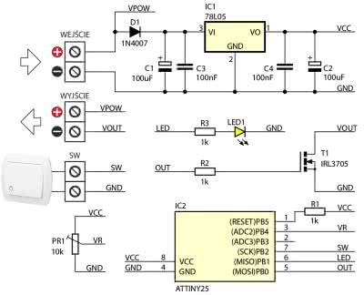 Dioda D1 zabezpiecza układ przed dołączeniem napięcia o niewłaściwej polaryzacji. Napięcie wejściowe jest podawane na stabilizator IC1 typu 78L05 dostarczający napięcia 5 V, a kondensatory C1...C4 zapewniają odpowiednią filtrację tego napięcia. Pracą układu steruje mikrokontroler IC2 typu ATtiny25. Elementem wykonawczym jest tranzystor T1 typu IRL3705.