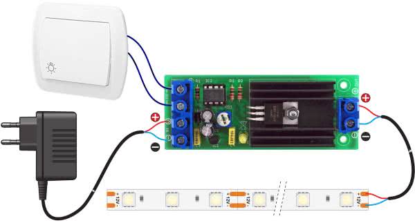 Sterownik przeznaczony jest do taśm LED oraz niektórych żarówek LED pracujących w konfiguracji diody z szeregowym rezystorem. Współpracuje z klasycznymi włącznikami typu włącz/wyłącz. Włączenie włącznika uruchamia układ płynnie, zaświecając dołączone do wyjścia układu źródło światła. Natomiast w momencie wyłączenia włącznika nastąpi jego płynne powolne wygaszenie. Czas rozjaśniania i wygaszania regulowany jest potencjometrem.