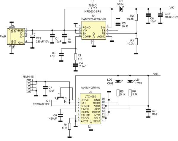 Ze względu na wygodę i dostępność ładowarka zasilana jest z portu USB. Do zasilania układu LTC4060 wymagane jest napięcie minimum 8,6 V dla poprawnego ładowania pakietu 4S i nie większe niż 10 V, ze względu na możliwość jego uszkodzenia. Za dostarczenie napięcia o wartości 8,8…9,0 V odpowiada przetwornica podwyższająca zbudowana na bazie układu U1 typu PAM2421. Napięcie wyjściowe jest ustalane dzielnikiem R2, R3, Pobór prądu z 5 V wynosi ok. 600 mA przy ładowaniu akumulatorów prądem 275 mA.