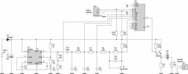 Wyjście 3 układu U2 jest połączone z wtórnikiem emiterowym T2. Amplitudę sygnału wyjściowego ustala potencjometr P1. Poziom sygnału wyjściowego będzie także zależny od rodzaju sygnału podawanego na wyjście generatora a także od wartości napięcia zasilającego. Układ generuje przy zasilaniu napięciem od 5 V do 10 V. Ze względu na niski pobór prądu ok. 10 mA generator może być zasilany z baterii 9 V.
