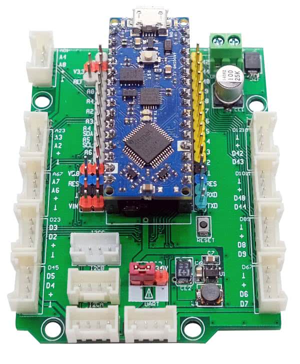 Zmontowaną płytkę, z zamontowanym modułem Arduino, pokazuje fotografia 1. Płytka nie wymaga uruchamiania, po podłączeniu źródła zasilania do złącza VM lub USB, należy tylko sprawdzić obecność napięcia VIO, które powinno wynosić 3,3 V, ±5%. Podczas montażu warto wyróżnić grupy sygnałów zasilania, wejść analogowych, cyfrowych oraz transmisji różnokolorowymi listwami kołkowymi – ułatwia to szybkie i bezbłędne połączenia z współpracującymi układami. Zamiennie ze złączami PH 2,00 mm mogą być stosowane złącza typu o oznaczeniu 110990030 zgodne z płytkami Grove.