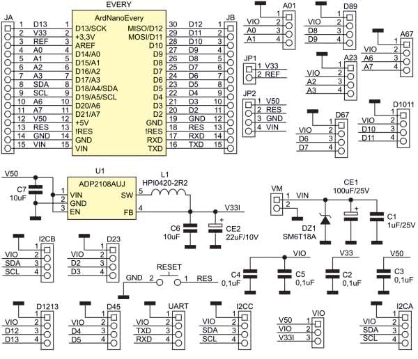 Na złącza szpilkowe JA i JB wyprowadzone są wszystkie sygnały z płytki Nano. Złącze JP zawiera zasilania VIN, V50, V33V i sygnał Reset. Do złącz czujników typu JST PH4, 2,00 mm lub Grove w zależności od preferencji, doprowadzone są wszystkie sygnały z Nano pogrupowane parami oraz zasilanie VIO. Złącza magistrali I2C, dla wygody podłączenia większej ilości czujników, zostało powielone. Ze względu na zapewnienie zgodności z płytkami BLE/IoT pracującymi w standardzie 3,3 V płytka bazowa umożliwia wybór napięcia VIO pomiędzy 5 V dla NanoEvery i 3,3 V dla pozostałych płytek przy pomocy zwory VIO. Napięcie 3,3 V dostarczane jest przez układ przetwornicy obniżającej U1 typu ADP2108.