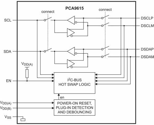 Moduł bazuje na specjalizowanym układzie bufora i kontrolera Hot-Swap magistrali I2C typu PCA9615 firmy NXP. Budowę wewnętrzną pokazano na rysunku 1. W swej strukturze układ zawiera kluczowane bufory sygnałów SDA, SCL sterowane sygnałem EN. Bufory izolują część magistrali od strony wejścia (SDA/SCL) i zapewniają zgodność ze standardem I2C, a od strony wyjścia (DSCLP/LM, DSDAP/AM) skonfigurowane są jako sygnały różnicowe - zapewniają większy zasięg i odporność na zakłócenia. Według noty producenta zasięg wynosi ok. 3 m dla trybu FM+ i może zostać zwiększony dla niższych prędkości. Oczywiście dla poprawnego działania potrzebne są dwa układy, zapewniające pełną konwersję sygnału.