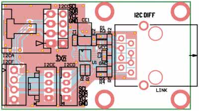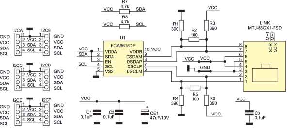 Schemat modułu został pokazany na rysunku 2. Magistrala I2C doprowadzona jest do złącz I2CA...I2CF, rezystory R7 i R8 zapewniają odpowiednią polaryzację. Układ U1 konwertuje sygnały do postaci symetrycznej dla linii danych SDA i zegara SCL, które po dopasowaniu przy pomocy elementów R1...R6 doprowadzone są do złącza LINK typu RJ45. Do połączenia pomiędzy modułami wykorzystany jest typowy kabel CAT5 (1:1).