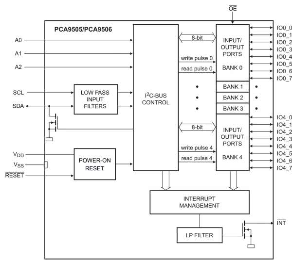 Wyprowadzenia układu PCA9506BS w trybie wyjściowym przy zasilaniu 3,3 V mogą być źródłem prądu o wartości ok. 8 mA lub pochłaniać prąd ok. 12 mA, o ile nieprzekroczona jest moc strat i sumaryczny prąd wyprowadzeń zasilania (max. 500 mA). Pozwala to na bezpośrednie podłączenie i sterowanie diodami lub wyświetlaczami LED.