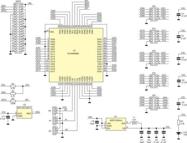 Schemat ideowy modułu został pokazany na rysunku 2. Został wyposażony w zwory adresowe dla PCA9506BS, umożliwiające ustawienie ośmiu adresów na magistrali I2C zgodnie z tabelą 1. Sygnały GPIO U1 wraz z zasilaniem 3,3 V wyprowadzone są na złącza szpilkowe IDC10 oznaczone I\O0...4. Ze względu na możliwy duży pobór prądu przy sterowaniu wskaźników LED, moduł wyposażony jest w niezależną od systemu zasilania Pi przetwornicę obniżającą U3 typu ADP2108 dostarczającą napięcia 3,3 V.