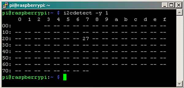 Do szybkiego przetestowania działania modułu podłączonego do Pi użyjemy bibliotekę i2ctools. Po ustawieniu adresu bazowego zworami A2, A1 i A0, moduł powinien być widoczny po odczycie magistrali poleceniem:i2cdetect -y 1