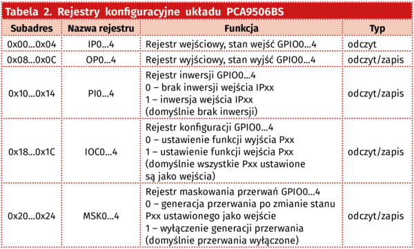 Po montażu należy ustalić kroplą cyny adres modułu na zworach A2, A1, A0 zgodnie z tabelą 1. PCA9506BS ma pod adresami 0x00..0x27 pięć grup rejestrów IO oraz ustalających tryb pracy układu i konfigurujących przerwania. Skrócony opis rejestrów pokazano w tabeli 2, pełny opis dostępny jest w karcie katalogowej.