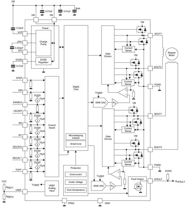 Układ uzupełniono o sygnalizację stanów awaryjnych takich jak przegrzanie, przeciążenie, zwarcie i blokadę podnapięciową, sygnalizowane na wyjściu nFAULT. Wbudowane układy pomiaru prądu uzwojeń eliminują konieczność stosowania niskoomowych rezystorów pomiarowych. Prosta i typowa aplikacja wykorzystująca sygnały STEP/DIR ułatwia zastosowanie modułu w układach elektromechanicznych, a w szczególności w robotyce amatorskiej, także podczas modernizacji, gdzie sterowanie mikrokrokiem może podnieść dokładność pozycjonowania.